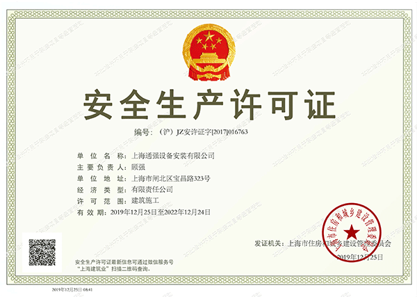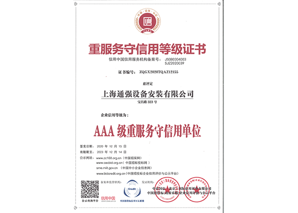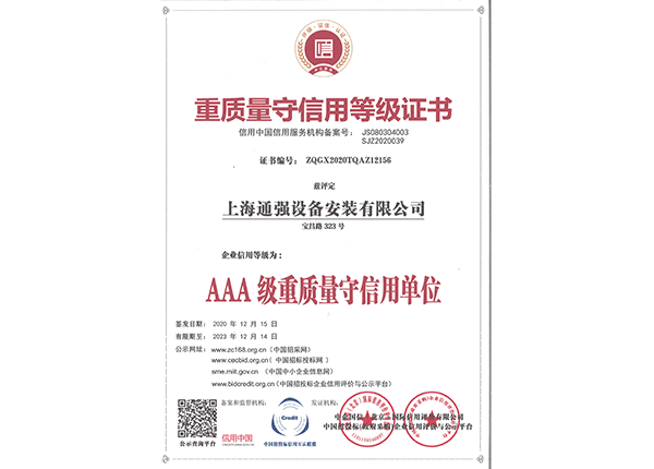 上海通強設備安裝有限公司注冊資金2000萬元,資產總量為100000萬元的專業設備安裝公司,公司專業從事工業與民用建筑的設備安裝、非標設備的制作、鋼結構制作安裝、中央空調系統的安裝,水電及管道的安裝。經過20多年艱苦創業現已成為一個具有國家二級安裝資質,獲得上海市“重合同,守信用”的施工單位。